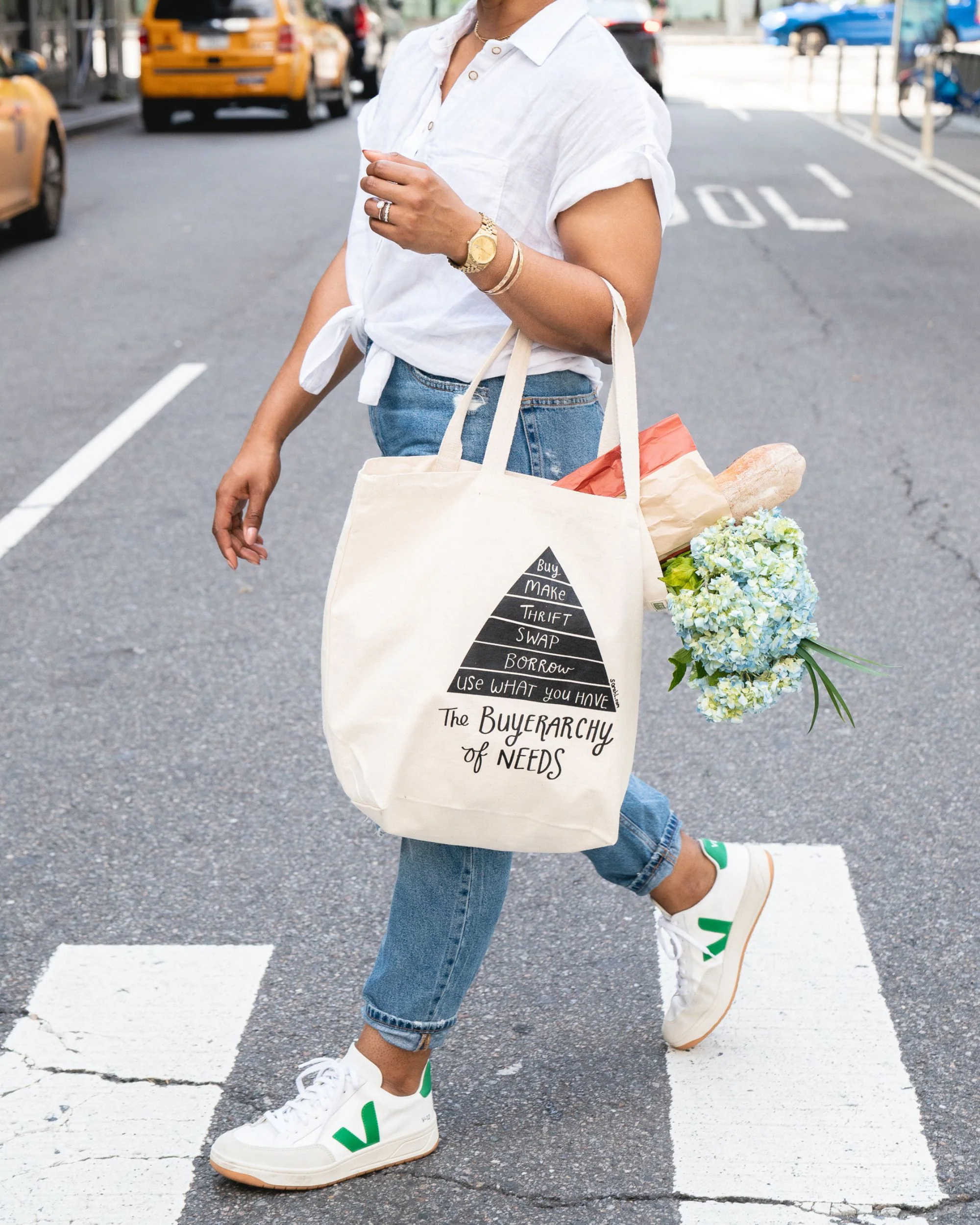This mindful design features Sarah Lazarovic's "The Buyerarchy of Needs", an iconic depiction of how to consume more sustainably.